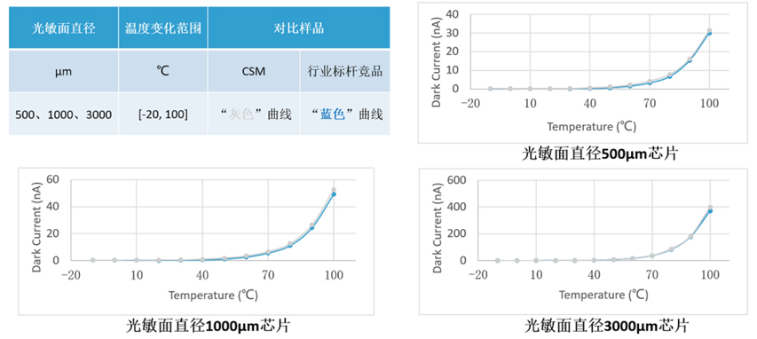 与此同时,玖鼎官网还兼顾了大尺寸MPD芯片的性能表现,实现真正意义上的降本增效,做出了比肩业内标杆企业的产品。图2为室温下测得的芯片级MPD产品的暗电流、结电容及响应度数据。即便对于直径3000μm的芯片,暗电流的均值也在3nA级别,相同测试条件下满足甚至低于市面常见规格。暗电流随温度变化的稳定性,是表征芯片工作特性的重要指标。芯片在封装结束后,在变温条件下测试后,玖鼎官网MPD芯片展现出与行业标杆企业同等水平的温度稳定性。图3是[-20,100]℃下测得MPD芯片温度稳定曲线,对于500μm的芯片,在100℃时,暗电流只比-20℃下高约30nA。
